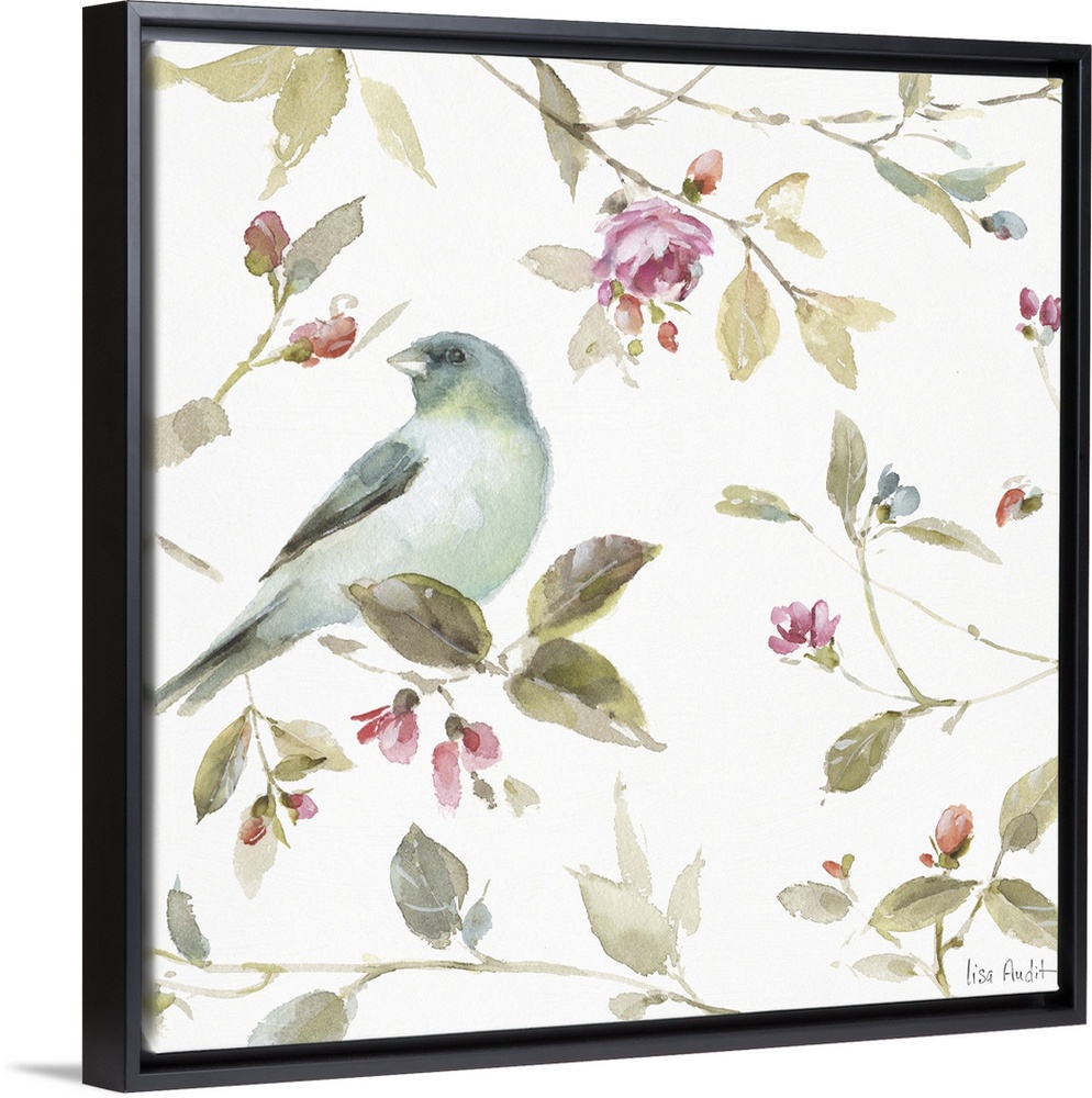 <p>Square watercolor painting with a blue songbird surrounded by leaves and pink buds and flowers.</p>