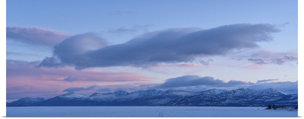 <p>Beautiful sky over Kluane Lake as sunlight illuminates the clouds above the frozen water. A peaceful and serene scene from the Yukon, Haines Junction, Yukon, Canada</p>