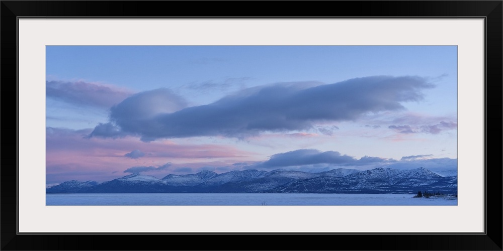 <p>Beautiful sky over Kluane Lake as sunlight illuminates the clouds above the frozen water. A peaceful and serene scene from the Yukon, Haines Junction, Yukon, Canada</p>
