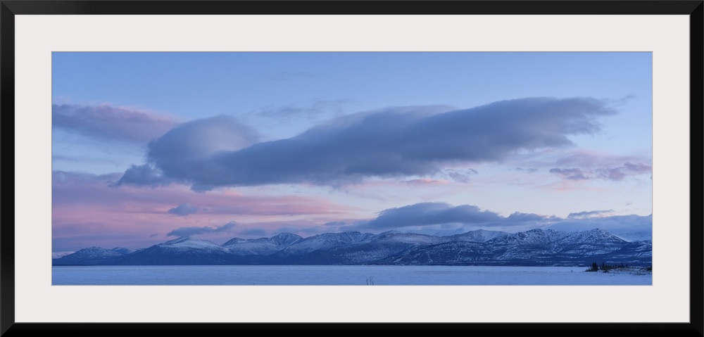 <p>Beautiful sky over Kluane Lake as sunlight illuminates the clouds above the frozen water. A peaceful and serene scene from the Yukon, Haines Junction, Yukon, Canada</p>