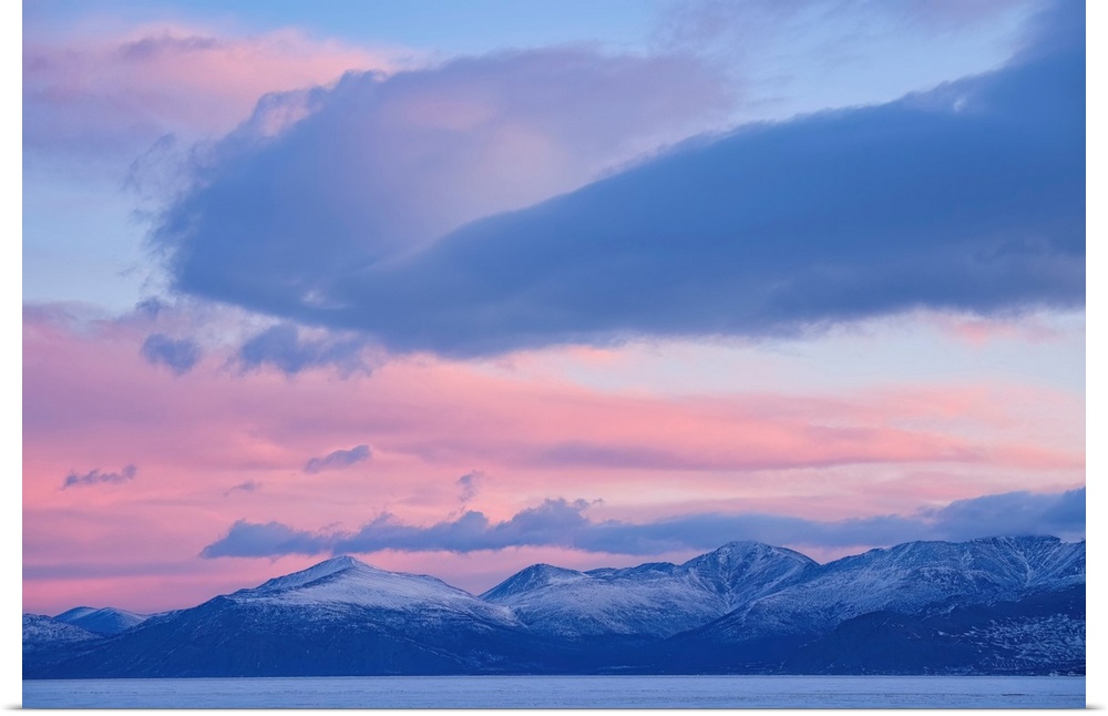 <p>Beautiful sky over Kluane Lake as sunlight illuminates the clouds above the frozen water. A peaceful and serene scene from the Yukon, Haines Junction, Yukon, Canada</p>