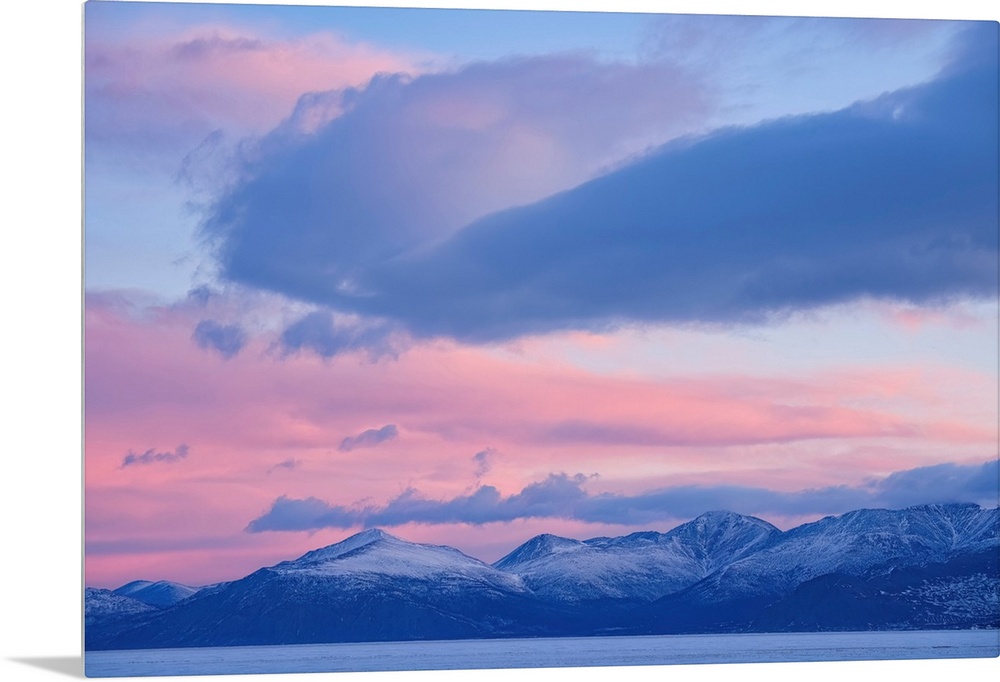 <p>Beautiful sky over Kluane Lake as sunlight illuminates the clouds above the frozen water. A peaceful and serene scene from the Yukon, Haines Junction, Yukon, Canada</p>