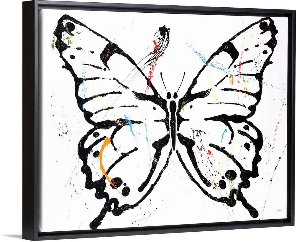 <p>Black outlined butterfly with colorful paint splatter on top on a white background.</p>