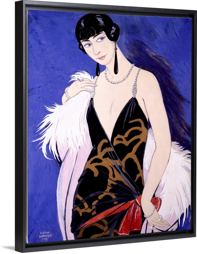 <p>Image of an idealized Art Deco Woman. An academically trained painter and illustrator, Barbier worked primarily for the fashion magazines of Paris, contributing not only drawings but articles, too. This is a preliminary study for his poster promoting a modish charitable affair in January 1923. That same month, he penned the following withering description of the event for la Gazette du bon ton: "The dowagers sit next to actresses and ageless, unidentifiable crones, embalmed by their lotions and potions, wearing their pearls like a disease...The beautiful people lean on their elbows with their elbows with their patrician faces and sigh...In the balconies, showgirls dressed in pink and blue put on innocent airs as if they were little shepherdesses...Forget the polite trappings of the cotillon;hands wave in the air with the crazy joy that madmen bring to their pleasures...". For all his barbed words, Barbier's image of an idealized Art Deco woman - short hair, plucked eyebrows, dangling earrings and plunging neckline - must have inspired at least as many ticket buyers as the deluxe raffle offerings.</p>