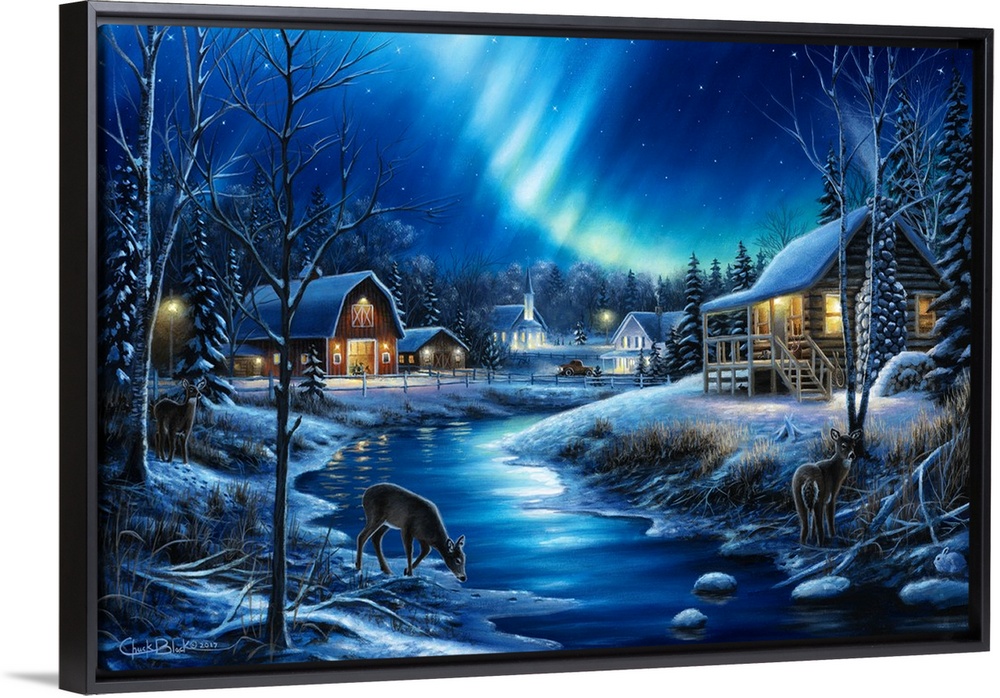 <p>Contemporary painting of a Winter landscape at night with a barn in the background and two deer drinking water in the foreground.</p>