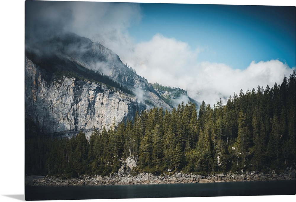 <p>Swiss landscape with fir trees and mountains</p>