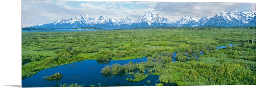<p>Beaver pond provides a stark contrast to the verdant greens of Willow Flats, Grand Teton National Park, Teton County, Wyoming, USA.</p>