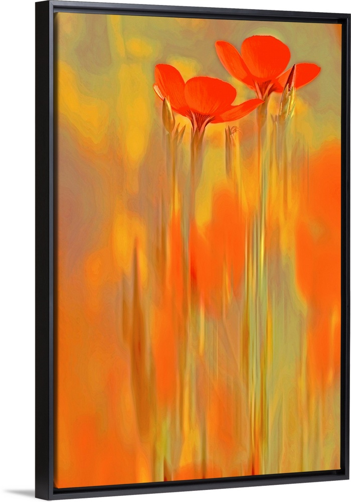 <p>A large vertical piece that has two long orange flowers shown surrounded by warm colors.</p>