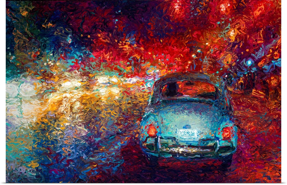 <p>Brightly colored contemporary artwork of a blue car driving at night.</p>