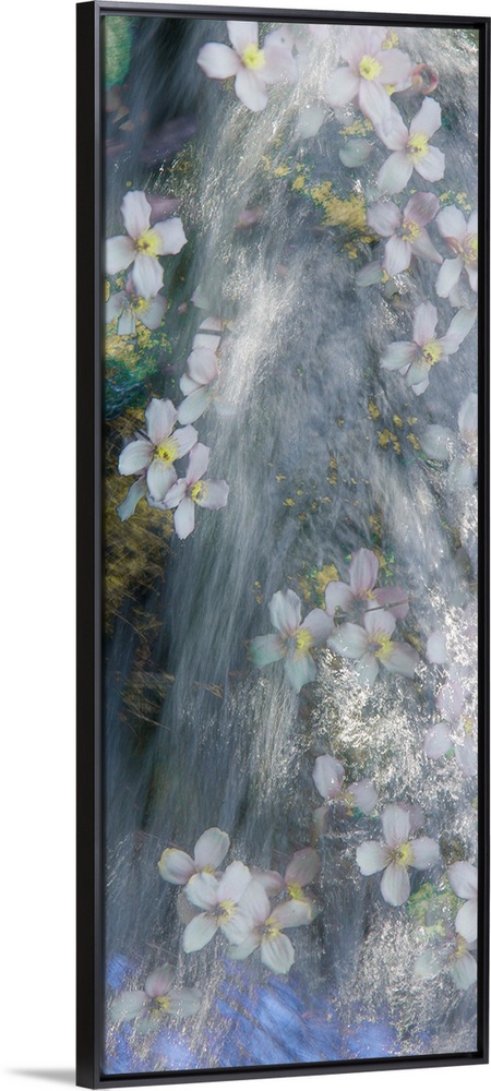 <p>Panel sized photograph with a dreamy look of flowers floating down a river.</p>