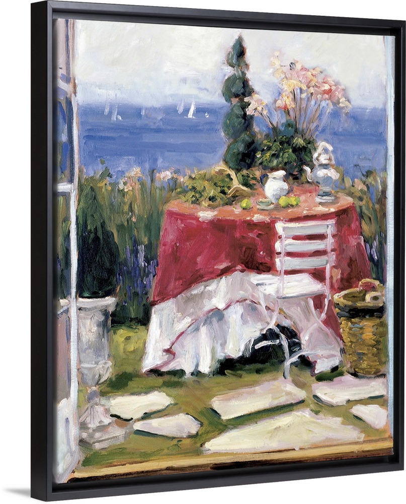 <p>Fine art oil painting landscape of a seaside cottage with open French windows looking out over a table on a cobblestone terrace by Allayn Stevens.</p>