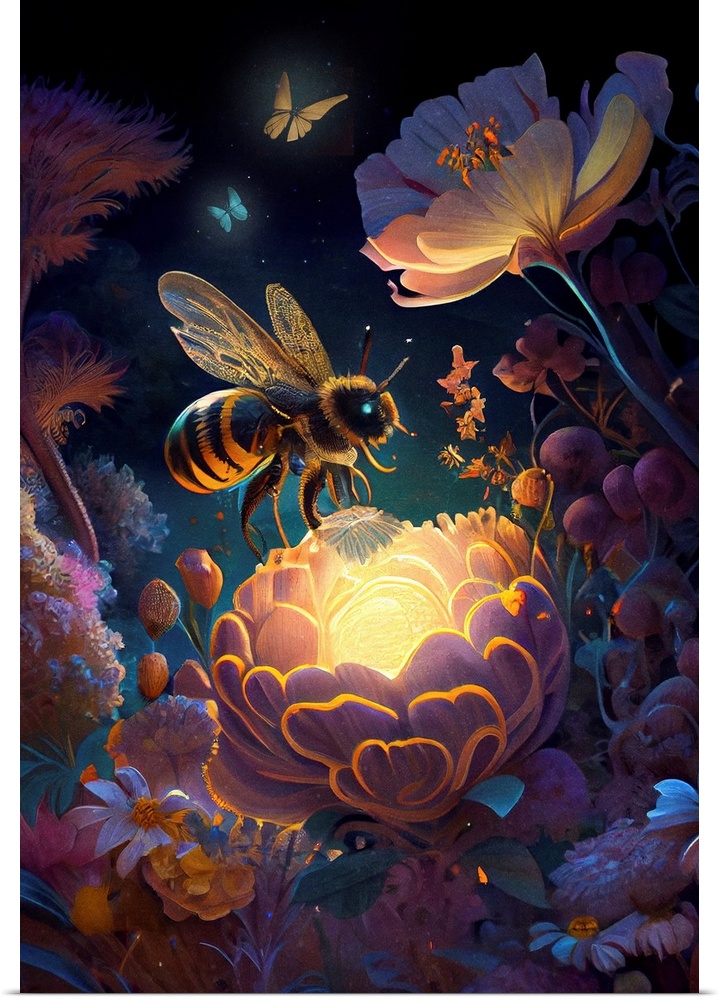 <p>This image by JK Stewart for Duirwaigh Studios features a bumblebee in a floral garden at night.</p>