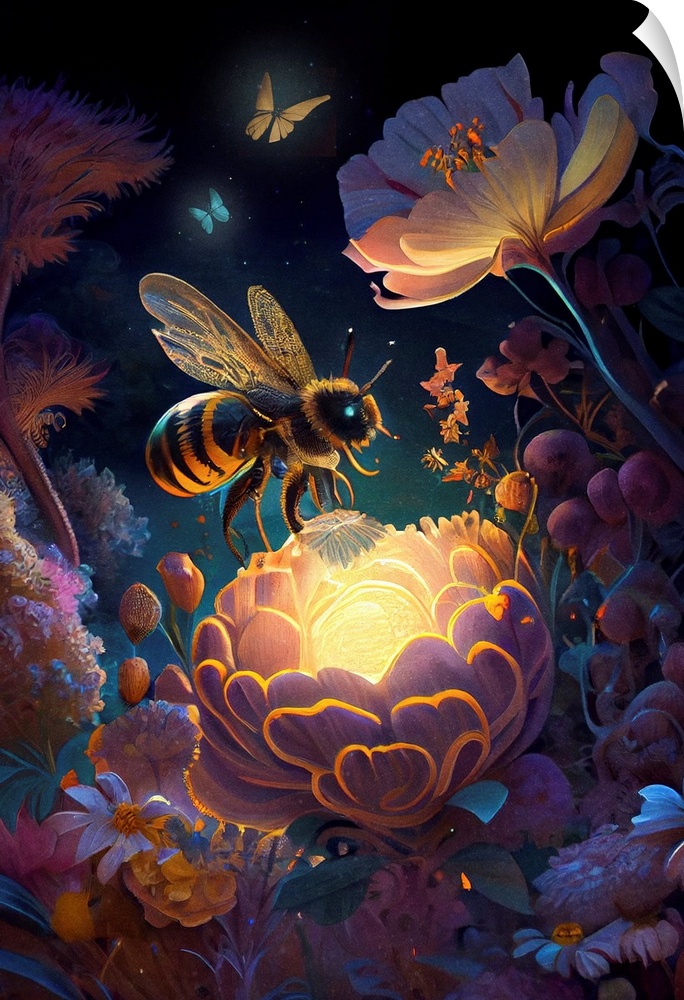 <p>This image by JK Stewart for Duirwaigh Studios features a bumblebee in a floral garden at night.</p>