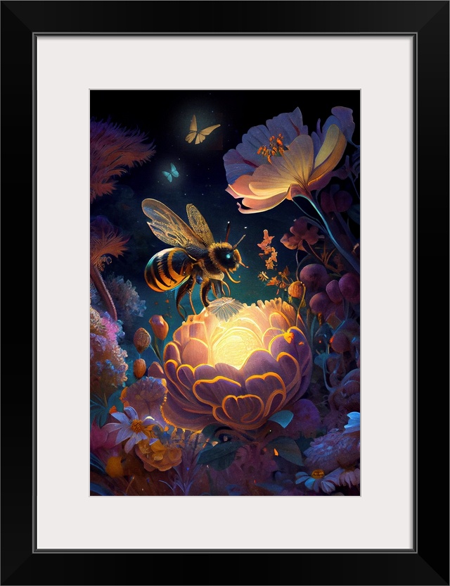 <p>This image by JK Stewart for Duirwaigh Studios features a bumblebee in a floral garden at night.</p>