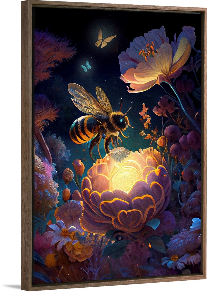 <p>This image by JK Stewart for Duirwaigh Studios features a bumblebee in a floral garden at night.</p>