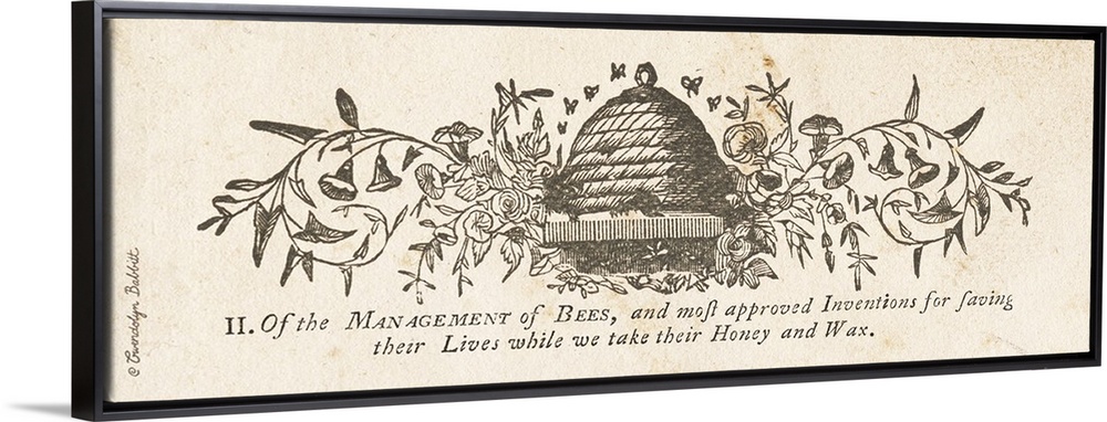 <p>Panoramic vintage illustration of a bees nest surrounded by florals and bees flying above with text at the bottom.</p>