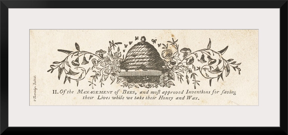 <p>Panoramic vintage illustration of a bees nest surrounded by florals and bees flying above with text at the bottom.</p>