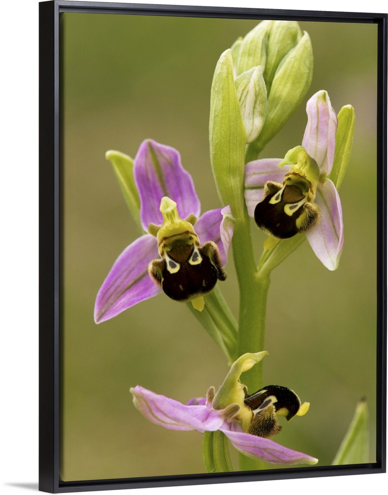 <p>Bee orchid (Ophrys apifera) flowers. This is one of the bee orchids, named for the distinctively shaped and marked parts that resemble insects such as bees. This part of each flower is a specialised petal, called a lip, that attracts pollinators.</p>
