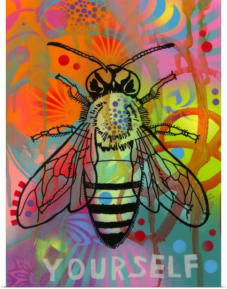<p>Black illustration of a bee on a colorful graffiti style background with "Yourself" written underneath the bee.</p>