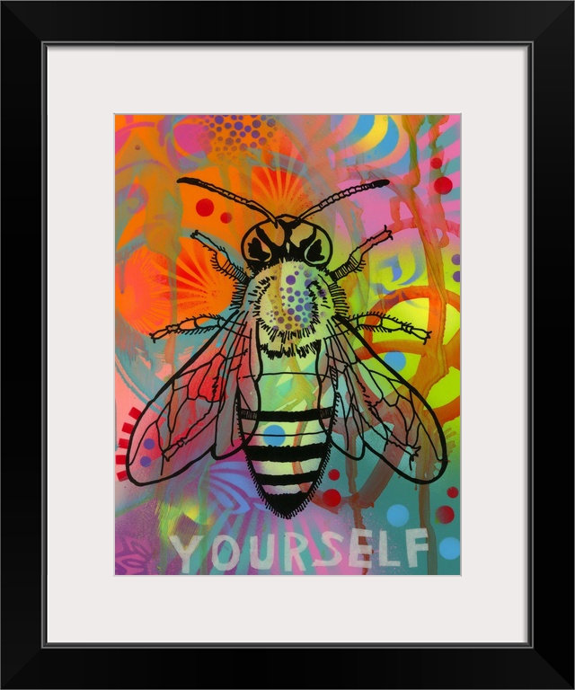 <p>Black illustration of a bee on a colorful graffiti style background with "Yourself" written underneath the bee.</p>