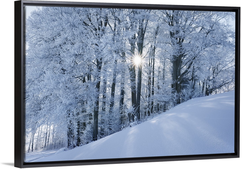 <p>Beech forest with hoar frost in winter. Germany, Bavaria, Upper Bavaria, Miesbach, Kleinpienzenau. Bavaria, Western Europe, Germany.</p>