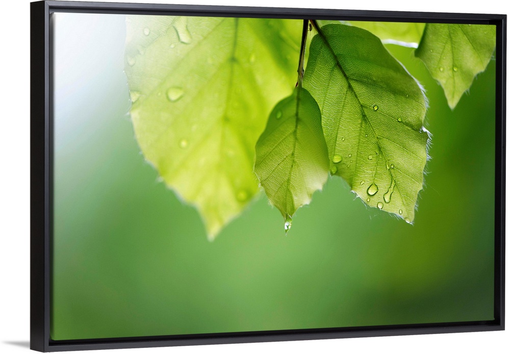 <p>Big artwork of leaves close up that have water droplets hanging on them. The background is blurred to focus on the leaves.</p>