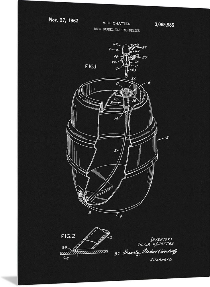 <p>Black and white blueprint of the beer barrel, patented November 27, 1962.</p>