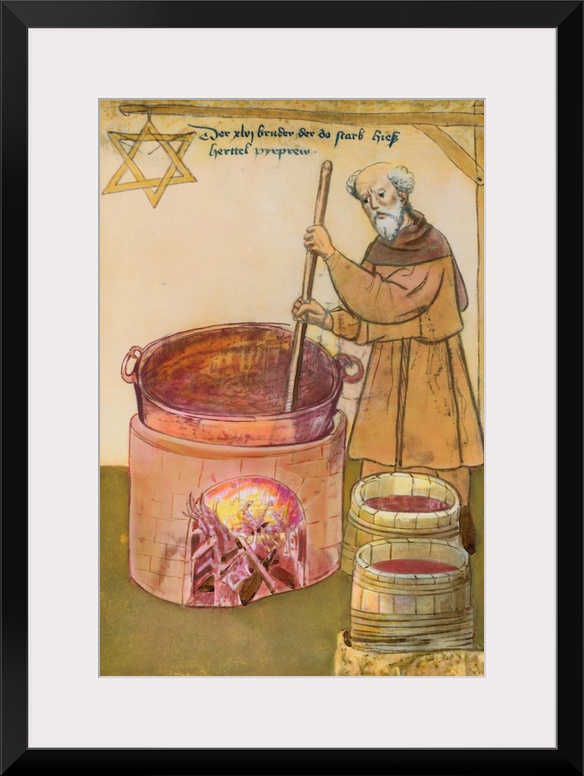 <p>Germany: Medieval Beer Brewer, in monk's garb. Colored manuscript illumination from Twelve Brother Foundation source book. Nuremberg.</p>