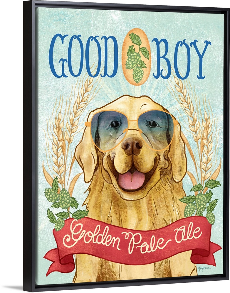 <p>Fun illustration of a golden retriever wearing sunglasses with wheat and hops around him and the text "Good Boy Golden Pale Ale"</p>
