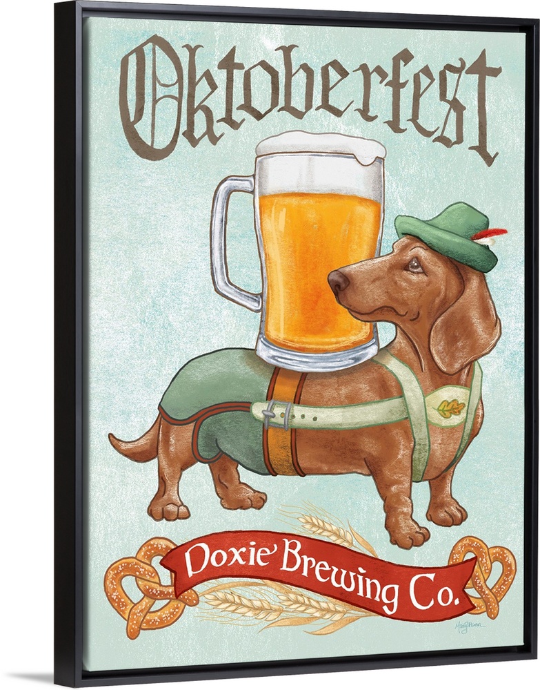 <p>Fun illustration of a doxie wearing lederhosen with a pint glass on its back and the text "Oktoberfest Doxie Brewing Co."</p>