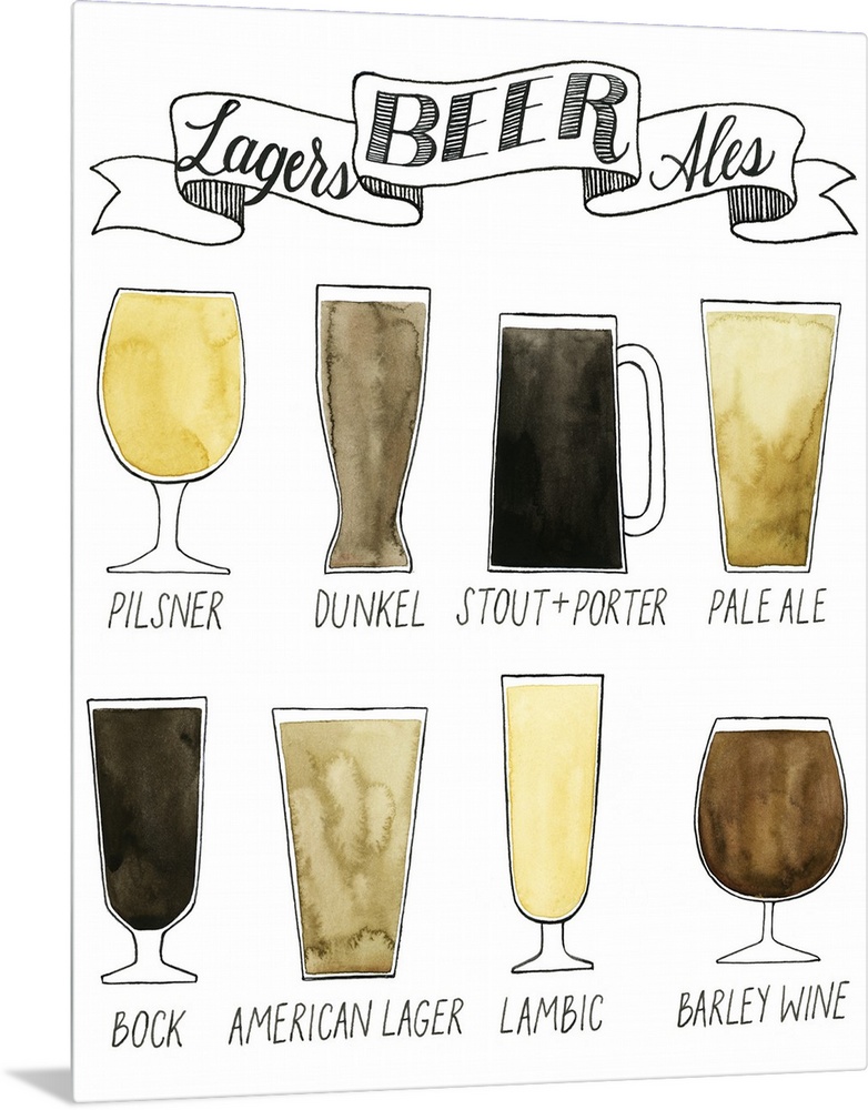 <p>Illustrated beer guide sign with the color and type of glass each type of beer should have.</p>