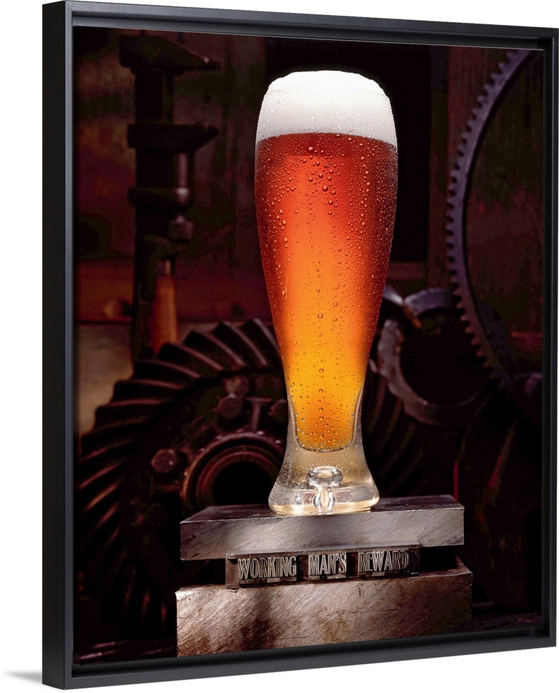 <p>Vertical, large wall picture of a tall glass of beer, foaming at the top, sitting on a platform that reads "Working man's reward", metal gears can be seen in the dark background.</p>
