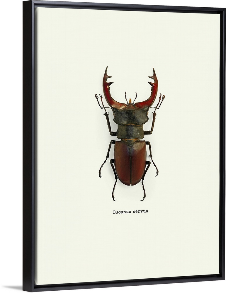 <p>Image of a red beetle with the scientific name below it, Lucanus Cervus.</p>