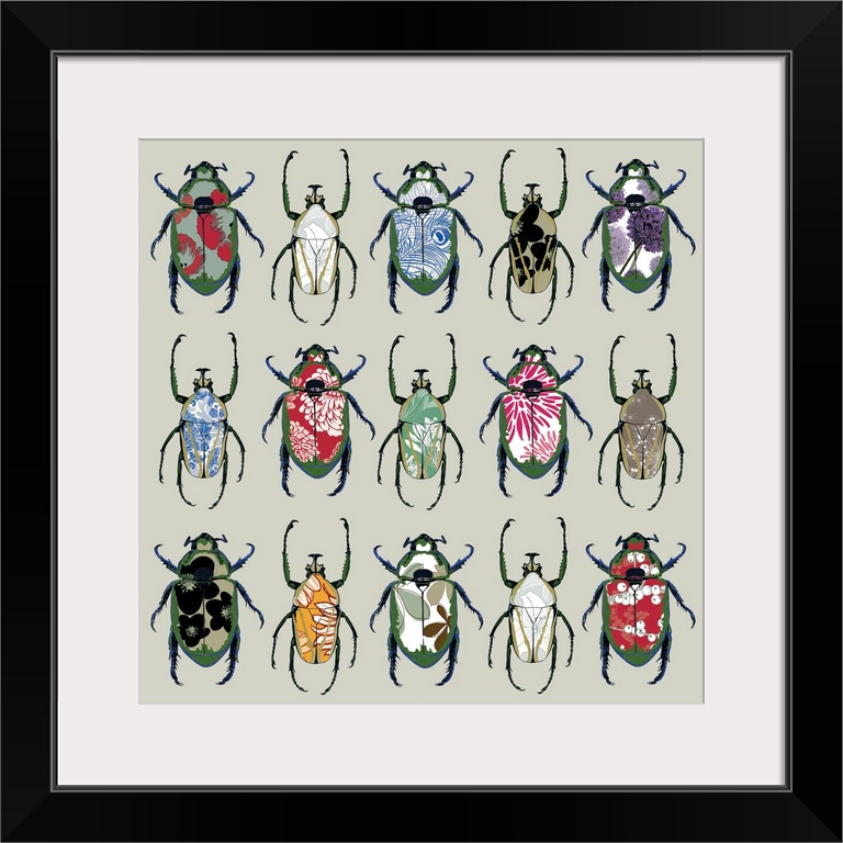 <p>Contemporary illustration of a pattern made of beetles with different patterns on their backs.</p>