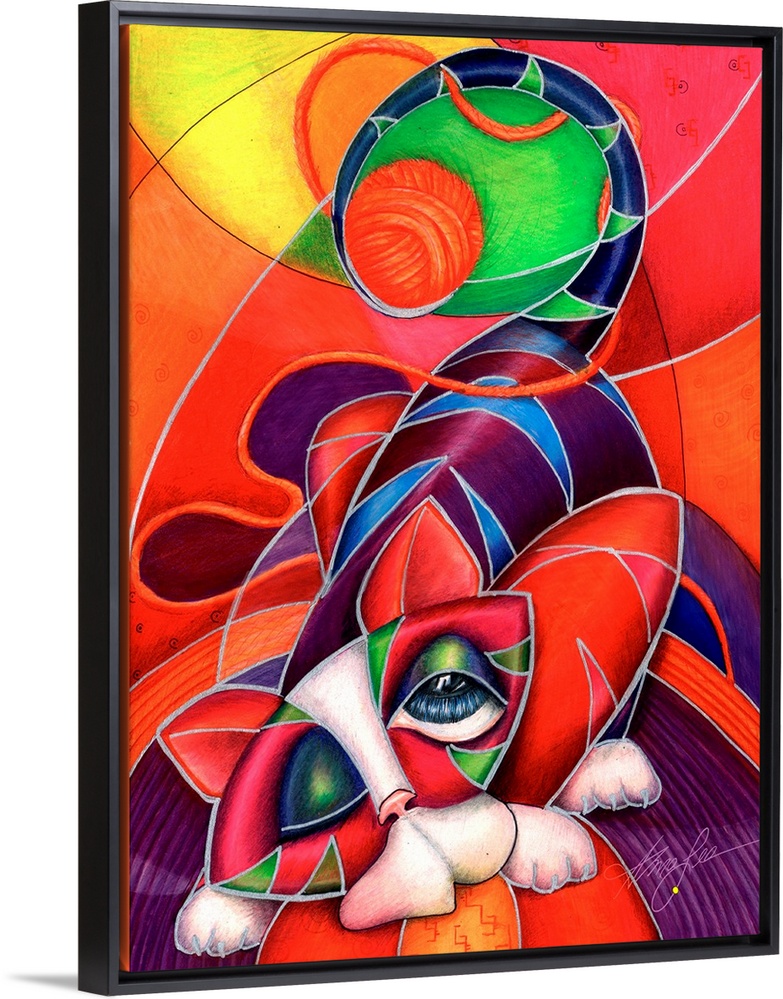 <p>Contemporary artwork in the style of cubism of a stretching cat in bold colors.</p>