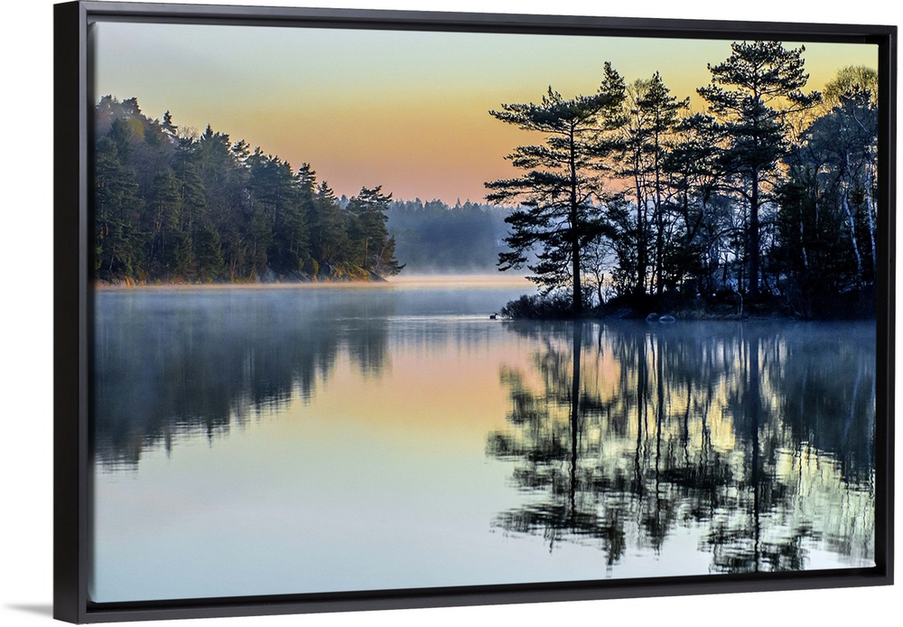 <p>Pastel rainbow sky over a lake in the early morning in Sweden.</p>