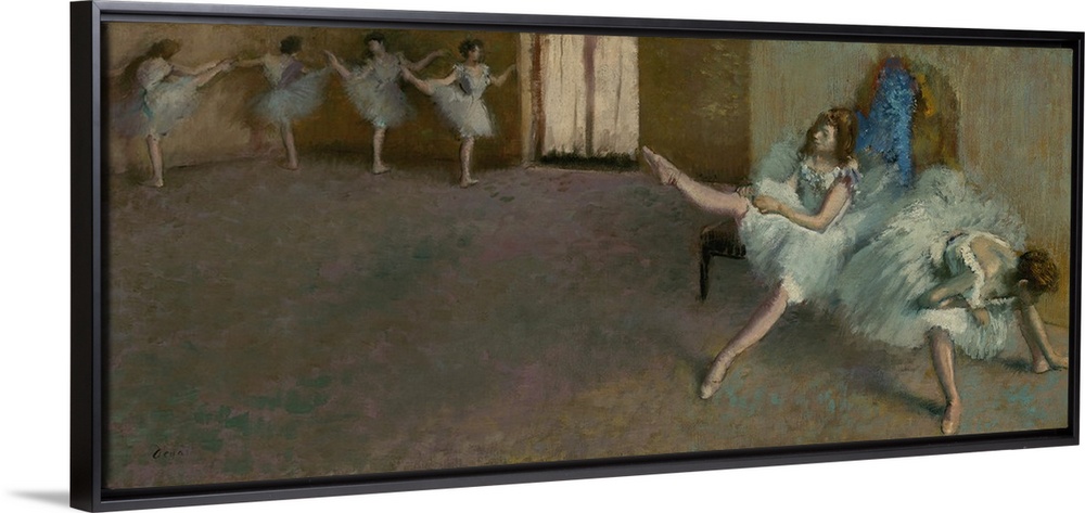 <p>Before the Ballet, by Edgar Degas, 1890-92. French impressionist painting, oil on canvas. Degas employs a non-traditional composition with dancers on the edges of the expanse of floor</p>
