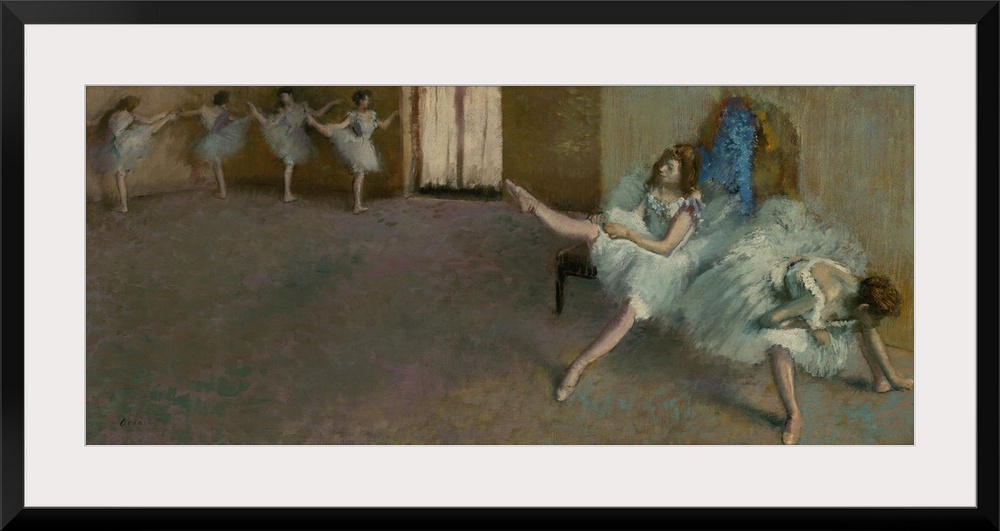 <p>Before the Ballet, by Edgar Degas, 1890-92. French impressionist painting, oil on canvas. Degas employs a non-traditional composition with dancers on the edges of the expanse of floor</p>