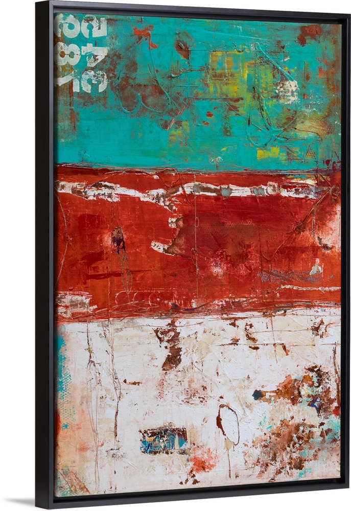 <p>Textured abstract painting in layered sections of teal, red, and white with pops of yellow on top and white numbers in the top corner.</p>