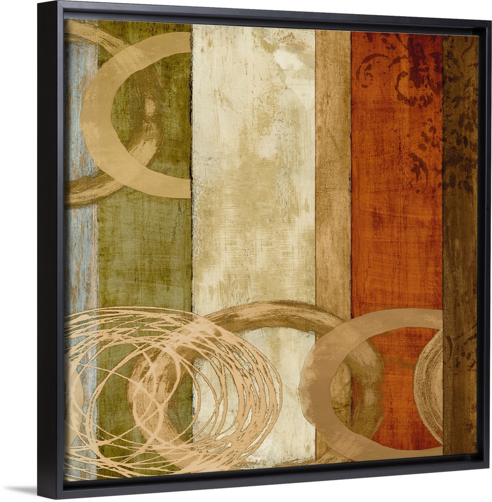 <p>Square abstract art with colorful vertical lines on the background and cream and gold circles on top.</p>