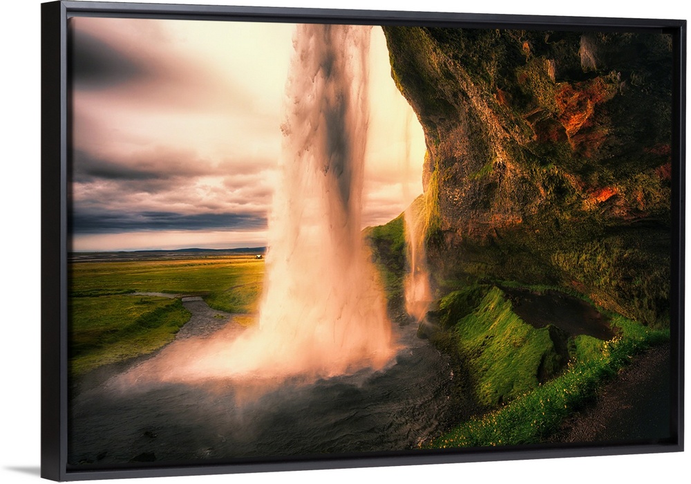 <p>View of the Seljalandsfoss Waterfall Behind from a Cave at Sunset, Iceland</p>