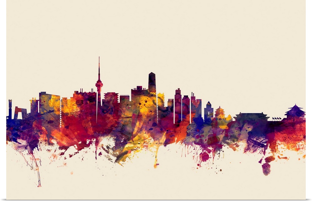 <p>Contemporary artwork of the Beijing city skyline in watercolor paint splashes.</p>