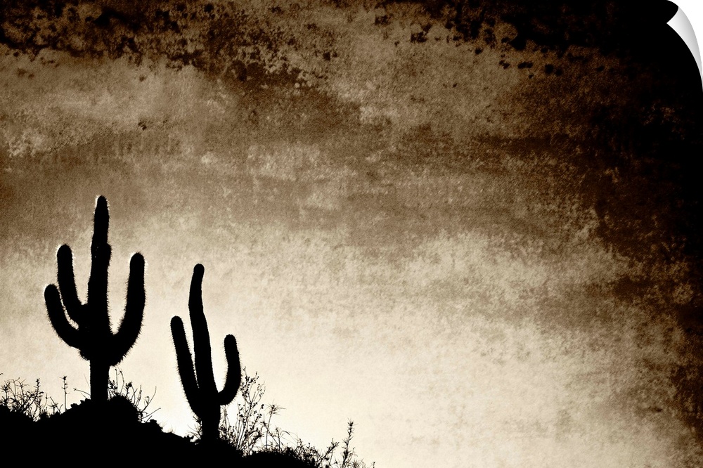<p>Cacti silhouetted against the afternoon sky in the desert landscape typical of the region near the town of Belen, Catamarca Province, Argentina. The town promotes itself as the Poncho Capital of Argentina, and there are many excellent workshops in the town and many ponchos for sale in the shops (some of them quite expensive).</p>