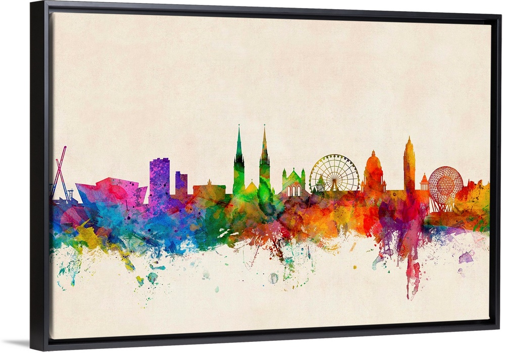 <p>Contemporary piece of artwork of the Belfast, Northern Ireland skyline made of colorful paint splashes.</p>