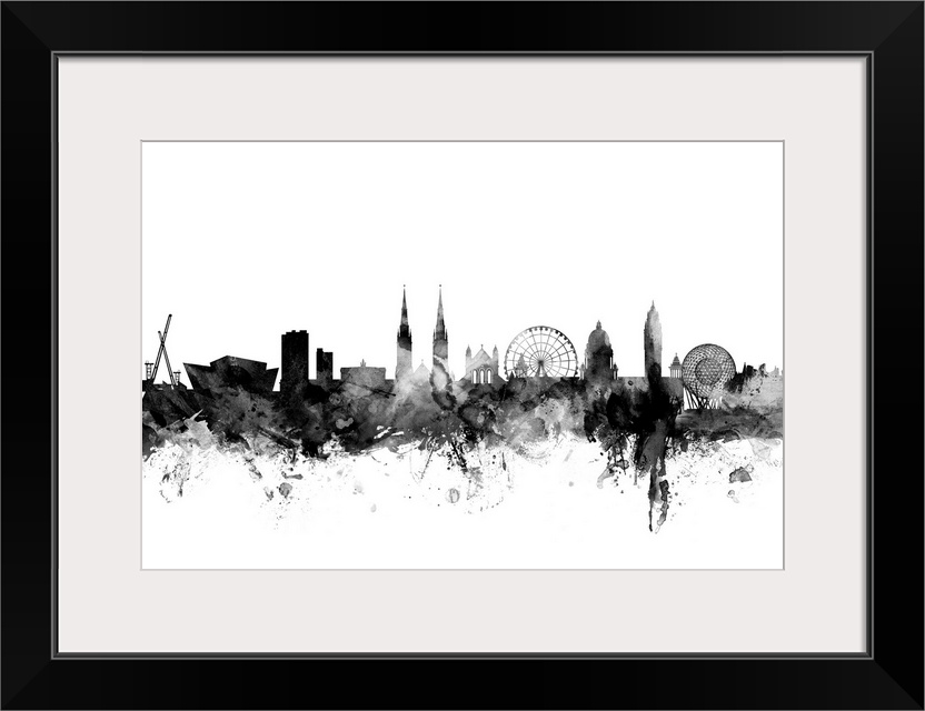 <p>Contemporary artwork of the Belfast city skyline in black watercolor paint splashes.</p>