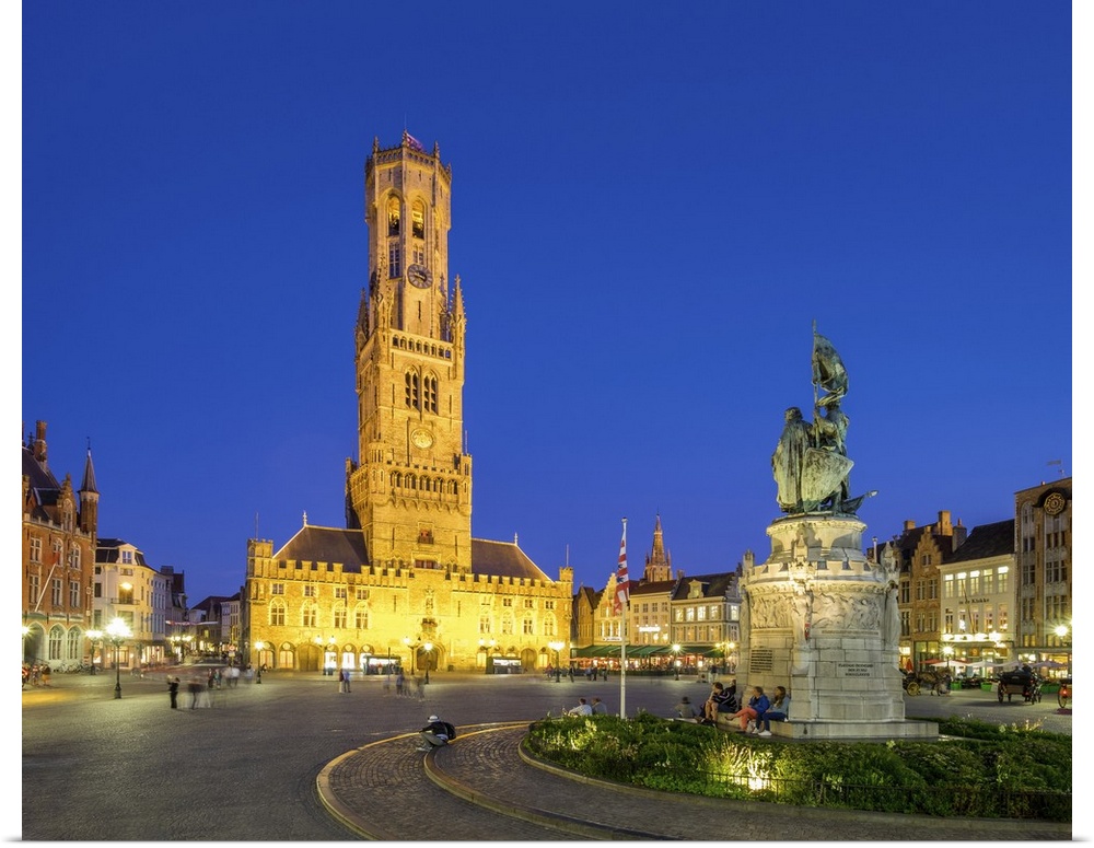 <p>Belgium, West Flanders (Vlaanderen), Bruges (Brugge). Belfort van Brugge belfry tower and Statue of Jan Christopher Breydel and Pieter de Coninck on Markt square at dusk.</p>