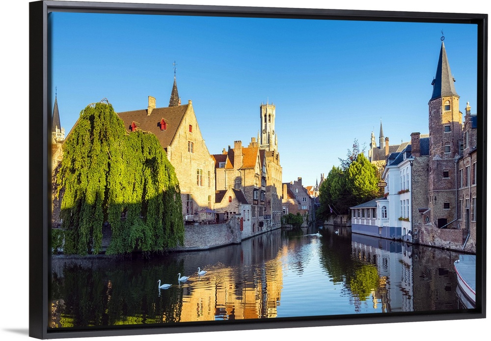 <p>Belgium, West Flanders (Vlaanderen), Bruges (Brugge). Belfort van Brugge and medieval buildings on the Dijver canal from Rozenhoedkaai at dawn.</p>