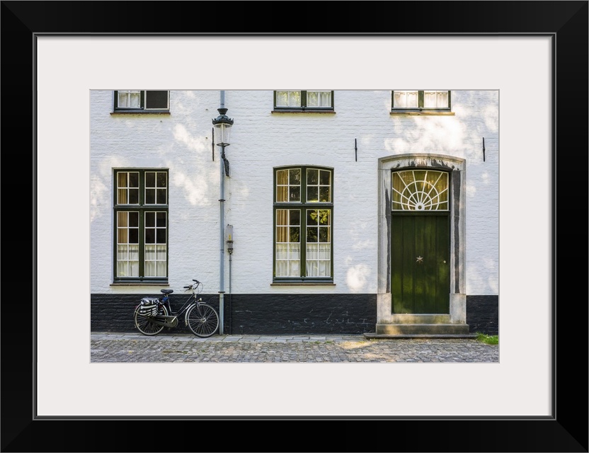 <p>Belgium, West Flanders (Vlaanderen), Bruges (Brugge). Bicycle next to a house in the Begijnhof (Beguinage) of Bruges.</p>