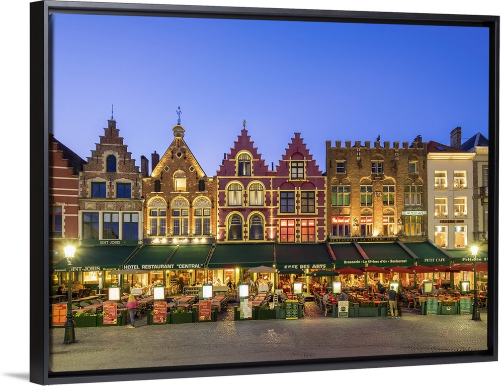 <p>Belgium, West Flanders (Vlaanderen), Bruges (Brugge). Medieval guild houses and restaurants on Markt square at dusk.</p>