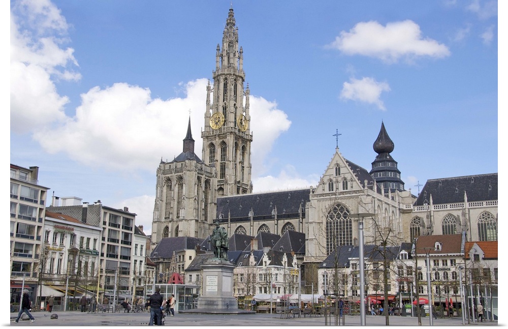 <p>Europe, Belgium, Flanders, Antwerp Province, Antwerp, the Groenplaats or green square, Statue of Rubens and Our Lady's Cathedral</p>
